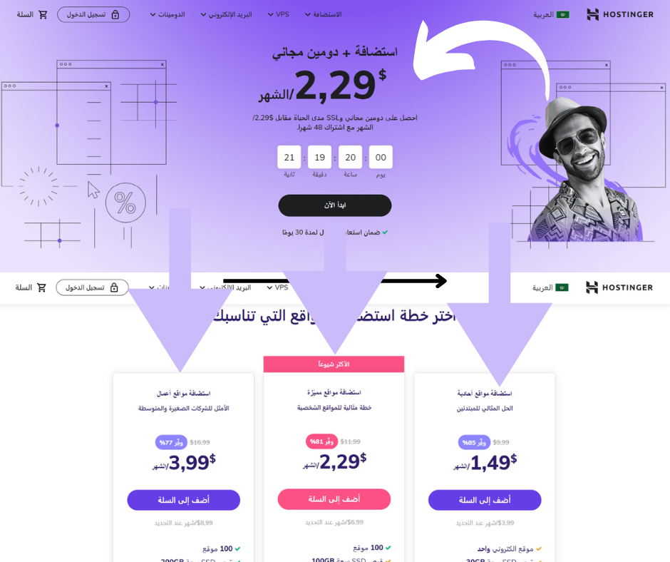 ستظهر هذه الصفحة ولكن السعر المذكور هنا هو سعر الخطة ل هوستنجر قبل الحصول على الخصم ولكن عندما تدخل وتختار خطة اسعارك المناسبة سيتغير السعر بصورة تلقائية الى السعر بعد الخصم كما هو موضح فى باقى الصور وكما هو موضح بالفيديو اسفل الصور