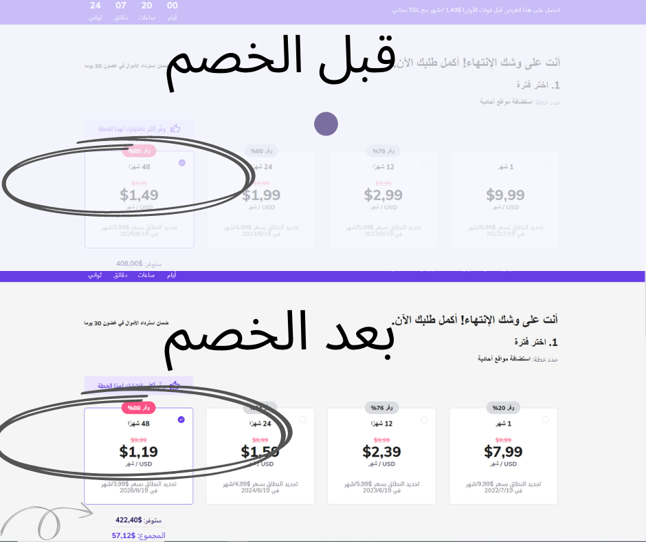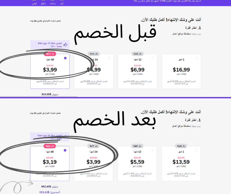 فى هذه الخطة السعر قبل الخصم و بعد الدخول على الرابط 3.99$ , و بعد الخصم 3.19$ فاذا كنت ترغب فى شراء هذه الخطة فلا ُتتم عملية الشراء الا عند تغيير السعر الى 3.19$ كما هو مذكور فى الصورة وبذلك تكون حصلت على الخصم الخاص بك بصورة صحيحة اما اذا لم يتغير السعر فعليكم فتح متصفح اخر حتى تتم عملية الشراء ثم الرجوع الى المتصفح الاصلى مرة اخرى بعد عملية الشراء .