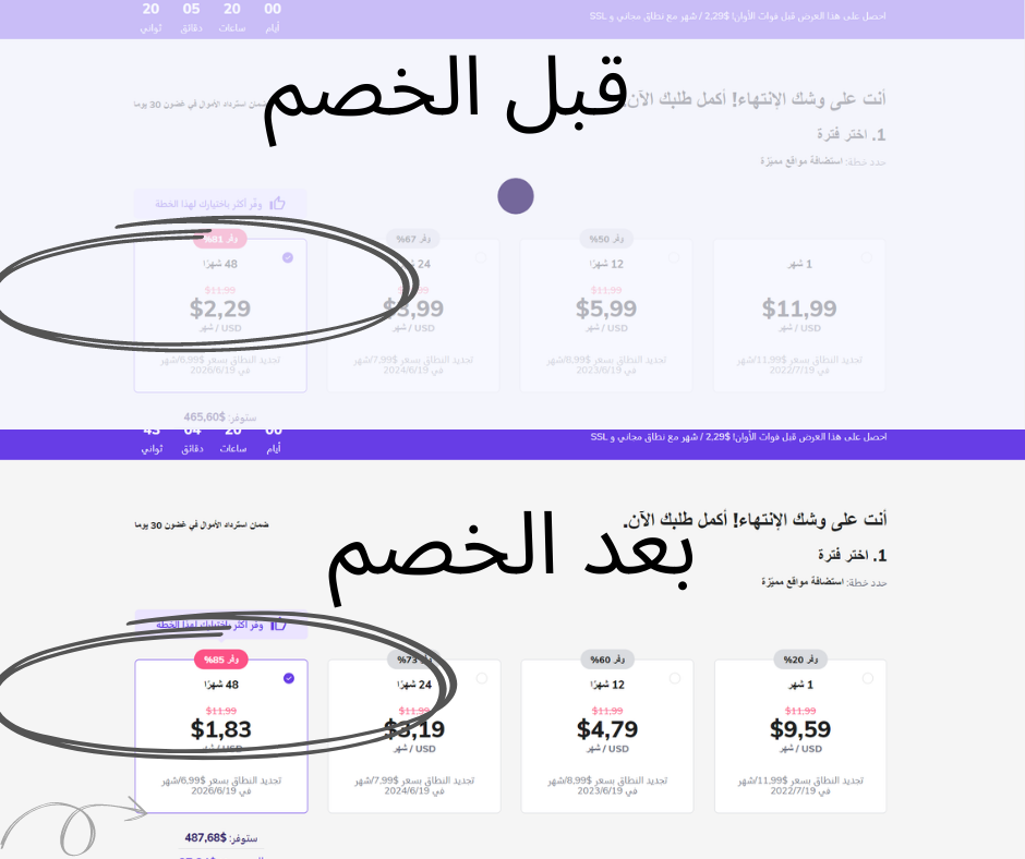 فى هذه الخطة السعر قبل الخصم بعد الدخول على الرابط 2.29$ وبعد الخصم 1.83$ فاذا كنت ترغب فى شراء هذه الخطة فلا ُتتم عملية الشراء الا عند تغيير السعر الى 1.83$ كما هو مذكور فى الصورة واذا لم يتغير السعر فعليكم فتح متصفح اخر حتى تتم عملية الشراء ثم الرجوع الى المتصفح الاصلى مرة اخرى بعد عملية الشراء .