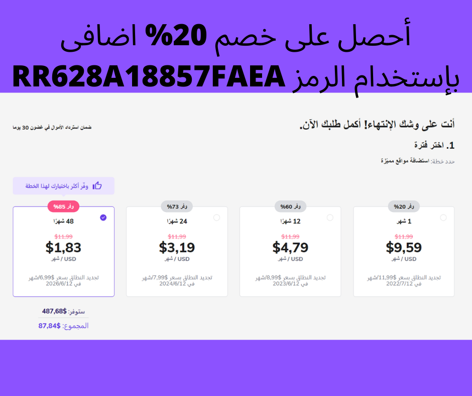 فى هذه الخطة السعر قبل الخصم بعد الدخول على الرابط 1.49$ وبعد الخصم 1.19$ فاذا كنت ترغب فى شراء هذه الخطة فلا تتم عملية الشراء الا عند تغيير السعر الى 1.19$ كما هو مذكور فى الصورة واذا لم يتغير السعر فعليكم فتح متصفح اخر حتى تتم عملية الشراء ثم الرجوع الى المتصفح الاصلى مرة اخرى بعد عملية الشراء